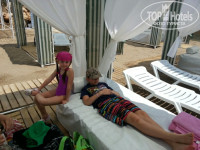 Погода, конечно немного огорчала. Утром было прохладно и ветренно. Несколько дней шел дождь. Благо в отеле созданы все условия для прекрасного отдыха в любую погоду, и утренние прохладные часы мы проводили в зоне крытого бассейна, грелись в сауне и парной. Мой папа прошел курс массажа. А ближе к обеду воздух прогревался и мы перебирались к открытому бассейну или на море. Первые несколько дней море штормило и купаться в нем было невозможно, но ко 2-му мая море стихло и мы уже могли плавать. Конечно вода пока прогрелась только до 20 -21°, но мы все и даже дети с удовольствием плавали в море. А еще мы смогли оценить по достоинству все преимущества от использования шатра на пляже. Шатер на первой линии был нам предоставлен в качестве подарка от отеля, как постоянным гостям, за что хочется сказать отдельное СПАСИБО от всей нашей семьи Жанне.