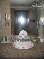 До отеля добрались где-то в 19 ч, заселение прошло быстро для такого количества народу, туда мы приехали целый автобус. Персонал ресепшена не очень приветливый. Нам дали номер 1311 на 3 этаже. Номер чистый, красиво все, в туалете тоже все чисто, т.к отель относительно новый, унитаз, ванна хорошо работают, не старье. У каждого номера есть балкон. нам достался номер с видом на двор, где теннисный корт. Вначале хотели поменять, хотелось чтоб был вид на море. Но есть один минус, со стороны моря также был бассейн, а где бассейн - там дискотека, вообщем всю ночь шумно. А так приходишь в свой номер - и тишинаааааааааа )))))) В номере убирались каждый день, полотенца меняли каждый день, воду в мини-бар оставляли даже лишко ))) фен работает, шампуни, кондиционер для волос, гель для душа, мыло давали каждый день. Почитала отзывы, складывается впечатление, что плохо убирались на верхних этажах, у нас все было идеально, хотя и не оставляли ни разу чаевые.