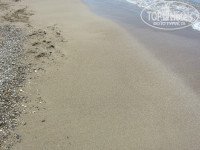 Вход в воду - песок. Хороший вход. В зависимости от волн и ветра вход иногда менялся - то становился резче, то намывало полоску мелких камешков. Но основное - это песок, достаточно пологий вход, камней, чтобы пораниться, нигде нет вообще, ни в воде, ни на суше. Работают спасатели.