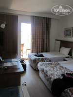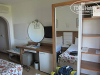 В номере: двуспальная кровать и одинарная, 3 прикроватные тумбочки, хороший шкаф-купе с огромным зеркалом, плоский телевизор на стене (каналов действительно много, и российские, и украинские, и немецкие, и турецкие, один с мультами), стол и над ним еще одно круглое большое зеркало с подсветкой, под столом - холодильник, спрятанный в тумбочке, рядом со столом - еще один низкий столик с металлическими планками, мы на нем гладили одежду. Правда, для чего эти планки, я так и не поняла. Центральной люстры нет, но светильников достаточно: над каждой кроватью и над зеркалом, в коридорчике сверху, там еще одно огромное зеркало. на стенах висят картины - пейзажи. Большинство выдвижных ящиков - с доводчиками :) Штора на окне толстенная, это очень классно - утром темно, хорошо спать. Кондиционер грамотно расположен, не будет дуть на кровати. Мы не включали, не было необходимости.