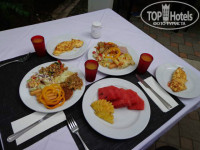 По прилету встретили двое парней, проводили к стойке регистрации,выдали водичку,усадили в минивэн,за 10 минут довезли до отеля. В отель приехали почти в 19-00 часов, заполнили небольшую анкету туриста. Было уже темно, носильщик сразу же забрал наши сумки и повел к номеру. Дорожки ровные,освещаются, щебечут птички, класс) Номер наш тропикал винг № 4002, от рецепшена 3 минуты ходьбы не спеша. Номер небольшой, уютный, весь беленький, очень чистый. На тарелочке лежали фрукты, сразу же ими перекусили, приятно было. В 5 метрах от домика бассейн, размером 14 на 6 метров, сразу же в нем искупались, вода отличная, 32 градуса. Все, что нужно для проживания, в номере есть - телевизор с 3 русскими каналами (№2, 20, 21), холодильник с минибаром, огромная, очень удобная кровать (2 матраса по 120 см каждый, спать было очень удобно, хотя мама моя очень придирчива к спальному месту, но даже ей понравилось), встроенная кровать у окна, прикроватная тумбочка. В ванной встроенный шкаф для вещей, там же сейф с индивидуальным кодом, ничего не ломалось и не воровалось. Фен, розетки адаптированы. Раковина, душевая, унитаз. Все чистое. Не понравилось только отсутствие звукоизоляции,если в соседнем номере кто-то живет, все будет слышно, будто они у вас в номере. Слава богу приезжали в основном китайцы, но они живут по 2 дня, поэтому сильно никто не мешал. Пьяные граждане нигде не валялись.