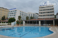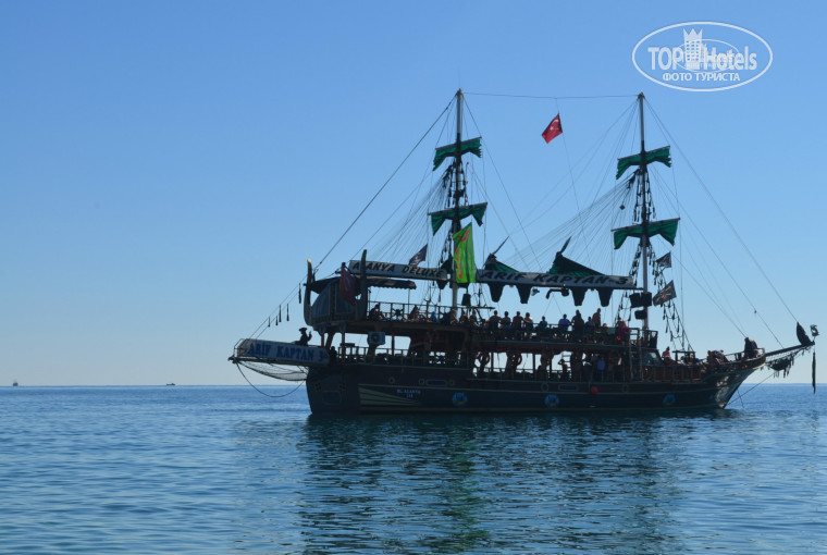 Территория отеля небольшая, но зелёная. Имеется 2 бассейна, один из них с горкой. Отель находится на окраине города, поэтому погулять поблизости негде. Но можно на автобусе доехать до Аланьи. Прямо через дорогу, по подземному переходу, находится море! Жаль, что пляж оставляет желать лучшего. Нууу очень маленький(( Я такой впервые видела. Нам благо повезло, что мы были на кануне закрытия отеля и лежаков на пляже хватало. А так думаю, что при разгаре сезона там совсем ютиться будут негде.