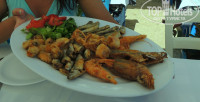 Ресторан просторный, можно располагаться внутри, но мы всегда выходили на завтрак и ужин на террасу ресторана, то с видом на бухту, то с видом на территорию отеля. Питание в ресторане хорошее, есть выбор рыбных, мясных блюд, мясо они готовить умеют и делают очень вкусно!!! Но я не так много всего этого ем, поэтому ассортимент блюд для меня был совершенно достаточным, для меня главное фрукты (каждый день были арбуз, яблоки, груши, киви, апельсины, грейпфруты, не считая консервированных фруктов) и мороженое, которое просто обожаю))) Еще мне очень понравились их супчики. Много выпечки, кремов, йогуртов, сухофруктов. У нас было питание НВ, то есть напитки за ужином платные, нас это не напрягало, мы были к этому готовы. Если мы ездили на экскурсию, то вместо завтрака заказывали с собой Ланч бокс, если экскурсия была вечерняя, то переносили ужин на обед. Многие вообще сразу переносили ужин на обед и по вечерам ездили в Неос Мармарас ужинать в вышеописанных тавернах. Кстати, поужинать в таверне на двоих около 30 евро (морепродукты, сок, пиво), порции там не маленькие, мы заказывали одну порцию на двоих.