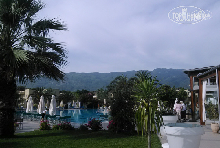 Територія отелю надзвичайно зелена,велика і доглянута.На території отелю є басейн великий з дитячим відділенням, лежаків було багато і вистачало всім.Біля басейну знаходився бар в якому подавали обід також там можна знайти напої на свій смак.