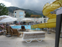 Сначала идет главный корпус, он 4-х этажный, в нем же находится хамам, далее – детская площадка и типа детской зоны отдыха с детскими столами и стульчиками, далее – в ряд парикмахерская, магазин кожи и детская комната. Парикмахерскую не посещали, не знаем, там работает девушка Зейнап, очень доброжелательная, всегда улыбнется, просто очень приятный человек. С утра и до 15 часов она на ресепшене работает, а с 15 до 23.00 (часы работы парикмахерской) - в салоне красоты. В магазине кожи работает Изольда – мы опять же никуда не ездили и ничего не брали, но не смотря на это – она каждый день была к нам доброй, позитивной, всегда спросит как дела. Так что рекомендуем, очень приятный человек! Детская комната начала работать только числа с 10 мая, там не очень много игрушек, но те, которые есть хорошие – конструкторы, мячики и т.п. Мы туда ходили всего 1 раз, когда еще не было много детей в отеле , а потом перестали, т.к. режим дня детей не совпадал с режимом работы комнаты, да и просто боялись подхватить от других детей какую-нибудь болячку, т.к. хочется отдохнуть, а не на больничном быть. В детской комнате работает аниматор Регина, она не только с детьми занимается, но и проводит гимнастику с утра, аква-аэробику, но об анимации ниже)).Далее идет столовая – большая, просторная, не тесно, и после выхода из столовой – бассейн, далее от бассейна - терраса с видом на море, в углублении – (как будто в яме) – сцена анимационная, сделана очень красиво, в виде амфитеатра, с большими, широкими ступенями, ну и спуск на пляж идет далее.