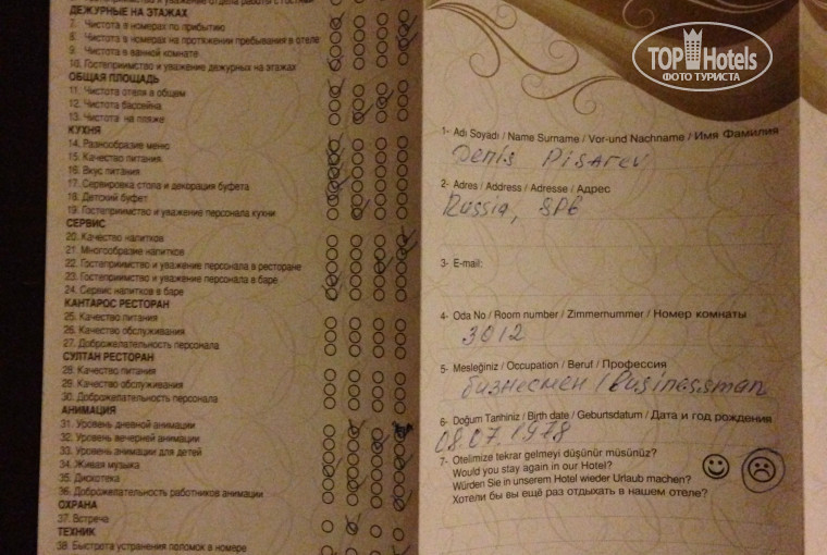 Оценка сервисов отеля автором
