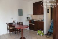 В семейном номере традиционно: кухня-гостинная с двумя кроватями (у нас там дети спали), обеденным столом и кухонной зоной. Есть чайник, микроволновка, плита, мойка, тостер, некоторый набор посуды. Местами странный:) У нас, например, была вилка была одна и ни одной чашки (только стаканы). Двери в эту комнату нет, вход сразу от порога. И отдельно с отдельной дверью спальня со сдвоенной кроватью.