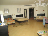 Семейный номер просторный, 3 больших кровати, терраса, сантехника работала исправно, сейф, телевизор (неплоский, русские каналы показывают не очень), кондиционер ну очень мощный, на всю ночь включать нельзя, простынешь. Вода горячая и холодная, перебоев не было. А вот убираться арабы не любят. За 12 дней, что мы там провели, мне дважды пришлось ходить не ресепшн и объяснять, что не нужно лебедей, сердец и зайцев из полотенец, а нужно просто вымыть пол и протереть пыль.