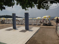 Песчаный пляж с пологим входом в море из мелкой гальки. Шезлонгов хватит всем))