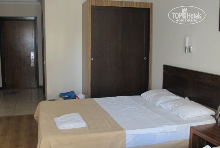 Мы летели от Pegas. Прилетели в 13-00. Получили багаж . Потом Нас встретили представители от турфирмы и посадили по автобусам по направлениям. В Турции вода в автобусе платная (и в номере тоже) - 1 доллар за 2 поллитровые бутылки. Поэтому надо иметь мелкие деньги сразу. Ехали на автобусе 3 часа, т.к. заезжали во все отели по пути. Дорога разделена , поэтому крутились. Смотрю наш пирс, но мы дальше проехали, развернулись и последние были в отеле в 17-00 по местному времени. Нас быстро заселили. Провели в номер на 1 этаже (лобби) ,но он как 2 этаж, т.к. высокий цоколь (хамам). Номер большой (однокомнатный), есть 2-х спальная, 1 - спальная кровати и диванчик (для 4 человека). Вид из номера на посёлок ( пальмы и новый построенный жилой комплекс с бассейном). В номере было тихо , но даже по вечерам было слышно с обратной стороны программы аниматоров.