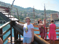 На экскурсии ездили от Pegas на обзорную Аланьи (на крепость и яхту Викинг) с 8-00 до 18-00. и на Мира-Кекова к Св.Николаю с 3-00 до 19-00. На втолрой день ходили в местный хамам (35 долларов на меня и 25 -на сына, дочку пеной покрыли бесплатно).