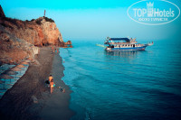 Кому лень читать предыдущие отзывы,в которых все написано, скажу,что войти в воду нормально, без использования своей медицинской франшизы можно только с пирса ,так как у берега находятся каменные скользкие плиты и входить по ним в море с ребенком, занятие рискованное и не безопасное, но все проблемы с лихвой решает дикий пляж - пройти всего на лево 100 метров и Аллилуйя - песок, прекрасный вход в море, живописные скалы для фотосессии и красивая яхта с туристами приплывающая в 11 часов для красивого заднего фона(все есть на фото ниже)