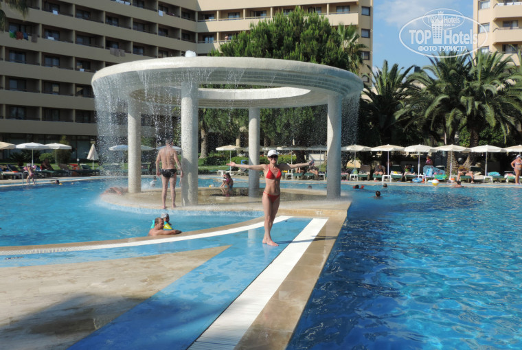 Территория отеля просто шикарная мы и выбирали отель из-за его зеленой территории и были приятно поражены как красиво все и ухожено пальмы, пальмы, пальмы...бассейн очень украшает отель, для детей есть детская площадка, видела ребятишек играющих в футбол. Для взрослых аквааэробика, приятная музыка в течение дня.