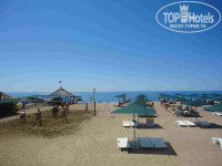 Пляж. Бассейны. Оценка 5. Пляж песчаный, большой, удобный. Убирается регулярно. Мусор в песке встречается, но не в промышленных масштабах. Небольшой контейнер для мусора у каждого зонтика- даже подниматься с лежака нет нужды. Зонтики в 6 рядов. Ситуации, чтобы совсем не было лежаков у моря – не возникало, где-нибудь сбоку в пятом-шестом ряду всегда оставалось. К бассейну и на горки мы приходили после 11ти, на час, у бассейна всегда можно было найти хотя бы один лежак, у горок тюфячков свободных в это время было уже не найти, но посидеть можно и на травке, хорошие газоны -рядом. Тем более, там не сидеть, а кататься надо. Видел, как пара бабусек жёстко грызли отельного гида за то, что турфирма не предупредила, что на пляже берег в воде круто уходит вниз. Нуу.. все относительно, лучше попытаемся разобраться, насколько круто, а там каждый сам для себя решит – подходит или нет. Там где-то 5 метров пологой зоны прибоя, когда море спокойное – вода заливает около 2х метров этой зоны, тут плещутся совсем маленькие детки, глубина в самом конце пологого спуска не более 20-25 см, потом начинается более крутой спуск. Пройдя ЕЩЕ около 2,5 метров оказываешься на глубине полутора метров. То есть уклон около 27 градусов, если геометрия мне не изменяет. Вдоль берега, на расстоянии 3-4 метров от суши, изредка получается этакая полоска из людей. Ширина полосы 1,5 – 2 метра, в ней взрослые играют с детьми, но за счет длины пляжа всем вполне удается встроиться в эту цепочку, не мешая другим. «Во всей красе» мне эту цепочку приходилось видеть не более 2х раз за 10 дней(в большую часть времени народу на нее не набирается.). А за этой цепочкой уже россыпью - плавающие. По поводу туалетов на пляже, на самом пляже их нет, но буквально на краю пляжа стоит с одной стороны – амфитеатр, ближе к середине – ресторан Кападокия(между бассейном и пляжем), где есть туалеты. На горках- свой туалет, куда можно быстро дойти с самого восточного края пляжа. Бассейн мы посещали не часто, могу только сказать, что детям нравилось играть на перегородке-дорожке между бассейнами, которая находилась ниже уровня воды(стоишь по щиколотку в воде) и что после обеда вода там уж чересчур теплая, на горках попрохладнее. Горки всем очень понравились, и старшим, и младшим.