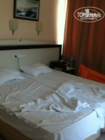 Чемоданы подняли на 3 этаж, в угловой номер с видом на променад. не шумно, но по утрам поют намаз, и это иногда слышно. балкон маленький, 2 стула и табуретка вместо стола, в номере 2 односпальные кровати, которые мы сдвинули, кондиционер (прекрасно работающий, спасал нас), холодильник, телевизор (что показывает- не знаю, не включали). Душевая нормальная, все хорошо работало. Мыла 2 размокших куска выкинули, поставили все свое. Ничего кроме туалетной бумаги не приносили (да и за бумагой один раз пришлось сходить).