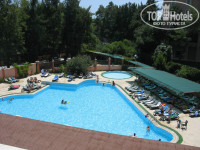 Отель маленький, территория минимум - бассейн, сцена аниматоров, место где пекут лепешки, бар. На одной с ним территории еще 3*. На них один бассейн (без горок) и один ресторан. В ресторане в обед и в ужин было жарко, работали потолочные вентиляторы, но они не спасали.
