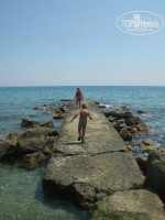 Загорали мы в основном у бассейна, т.к. дети не хотели плавать в море, но иногда ходили и на пляж. Да, вход очень неудобен, но у нас были тапочки для плавания. Мы еще ходили вдоль берега и насобирали много красивых ракушек, там чуть дальше есть небольшая горная речушка, впадающая в море и очень красивая отмель, еще дальше есть полуразрушенные старые пирсы - мы с детьми там видели крабов и морских ежей, и даже маленького осьминога. Подсвеченные вечером фонтаны изумительны, как, впрочем, и вся территория. Да, у моря есть детская площадка - так вот каждый вечер после ужина мы были там с детьми часов до 10 - ребятни очень много, и русских и греков из соседних вилл, а взрослым можно сверху с террасы таверны наблюдать за их играми потягивая вино. За время нашего отдыха на территории отеля провели 5 греческих свадеб - очень интересно было ненадолго окунуться в чужие традиции, очень понравился сертаки в исполнении не артистов, а обычных людей, да и сами свадьбы очень красивы.