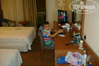 В отель приехали около 17 часов , номер дали сразу . Пока я заполнял анкету моих уже обраслетили и девушка с рецепшин ждала с браслетом пока я допишу. Номер дали 1731 на седьмом этаже с видом на дорогу , нас это устраивало. Номер свежий , мебель новая, телевизор плоский (81 см) , две двуспальные кровати в ванне тоже всё новое.