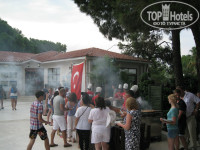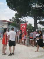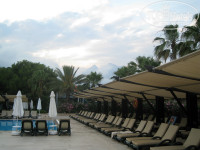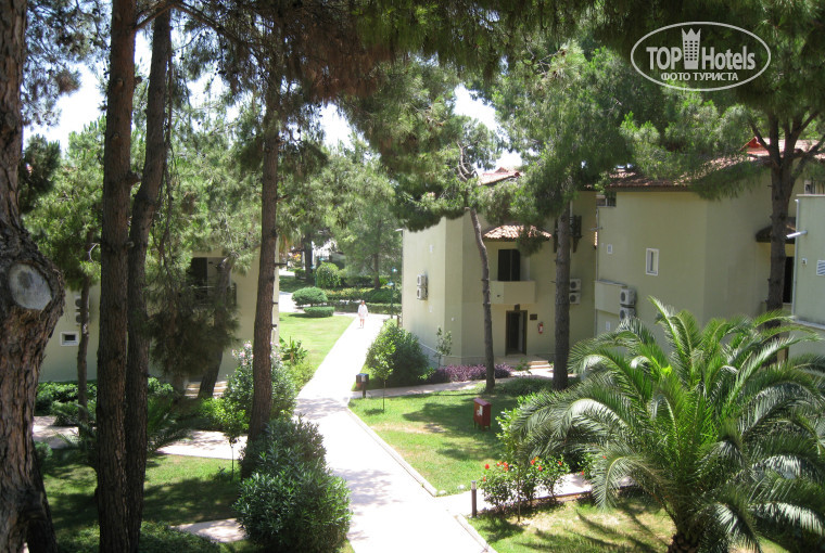 Вот и закончился отдых, и сразу хочу поделиться впечатлениями. Летали Тез-Туром. Приехали в отель в 8-45 утра, 2 июля, сразу нам предложили 2 стандартных номера рядом, нас в семье 4 человек -2 взрослых и 2 детей подростков. Я отказался, сказав, что в ваучере семейный номер. Надев нам браслет на руку отправили на завтрак. Вернувшись с завтрака нам выдали карточку от номера и 4 карточки на полотенца. На электро-машинке отвезли с вещами до домика и внесли вещи в номер. Семейный номер был на 3 этаже, надо сказать, что в отеле все номера находятся в коттеджах на 2 подъезда и 5 номеров в каждом подъезде. Семейный номер состоит из 2 комнат, туалетной комнаты и небольшой прихожей, номера маленькие, но это не напрягало, потому как в номер приходили только ночевать.В номере 2 телевизора (в каждой комнате по телеку), 3 телефона-в каждой комнате и туалете, также 2 кондиционера. Два балкончика, на одном стол и 2 стульчика, на другом- ну можно стоять одному. Телевидение показывает 5 каналов русскоязычных, плюс казахский канал, иногда вещает на русском. Мини бар пополнялся ежедневно, это 8 банок(пепси, миринда, севенап) 2 маленькие бутылочки минералки, и 4 бутылки воды.Полотенца меняли ежедневно, как меняли белье честно говоря не отслеживал, но грязным оно не было.На территории отеля, в барах и возле бассейна, стоят холодильники с водой, бери сколько хочешь, так же и в барах- наливают сколько хочешь и чего хочешь, пиво можно брать в бутылках и разливное, так же есть холодильник в айраном.О питании- огромный выбор, есть и мясо и рыба и овощи и фрукты. Среда -рыбный день- на улице готовят несколько видов рыбы. Пятница -день турецкой кухни, на улице готовят-шашлык, люля ке баб, ягненка, баранину...Всё очень вкусно. Огромный выбор сладостей, пирожных, и прочего. Фрукты-арбуз, дыня, киви, слива, яблоки, апельсины, абрикосы, персики, на ужин еще и черешня. Территория отеля, ухоженная -моют дорожки с мылом, много растительности. Отель можно сказать расположен в сосновом бору. Анимация- водное поло, волейбол, игра в дартс, стрельба из пневматики, игра в бочо- кидание шаров на песчаной площадке, соревнование в бассейне, гимнастика. Мы играли в дартс, в бочо(нравилось детям) стреляли из винтовки, играли в настольный теннис. Есть платный 2 дорожечный боулинг( 5долларов на человека по 10 бросков), но это уже не к отелю, а частный бизнес -рядом с магазинами. Мороженное бывает с 12 до 17, видов 6, брать можно также сколько унесешь, выдают двое или один официант, бывают очереди человек из 10, но редко...