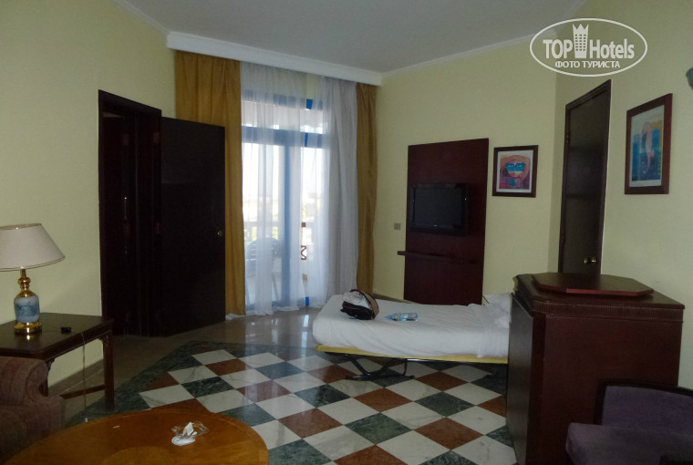 2. Нам должны были дать номер Family Suite, о котором так мало отзывов в Интернете. Их всего 12 в отеле и они имеют смежную дверь. По цене это дешевле, чем 2 отдельных номера. Предварительно нам подтвердили в Москве места в Family Suite. Весь автобус ехал из аэропорта в этот отель, народу в этом отеле в это время ооочень много. При регистрации нас хотели заселить в обычный номер всех троих, мы стали спрашивать будет ли там смежная дверь, на ресепшене начали делать вид, что не понимают, что мы хотим. Мы стояли на своем, так как нам нужно было иметь 2 отдельные комнаты, тогда дружелюбный менеджер повез нас на машине, чтобы мы посмотрели номер. Family Suite, который нам предложили, номер 4123, оказался действительно со смежной дверью, большая просторная комната с двуспальной кроватью, плоским телевизором, шкафом-купе, 2-мя стульями, столом, рабочим столом с зеркалом и смежная комната также просторная с раскладушкой и односпальным матрацем, плоским телевизором, 2 дивана, стол, шкафа нет, 2 балкона с шикарным видом на море, раздельные 1 душ с туалетом и биде, 1 фен и 1 ванна с туалетом и биде. В номере 1 бесплатный сейф, 2 чайника с чаем, кофе, сахаром. Нам, конечно же, все сразу понравилось, я согласилась спать на раскладушке. Затем нам на выбор предложили один из так называемых 2-х этажных шалле, в котором не было ремонта, но имелись 2 отдельные комнаты с отдельным санузлом. В шалле не было шикарного вида на море и выглядел он хуже, чем предложенный Family Suite. Мы выбрали Family Suite.