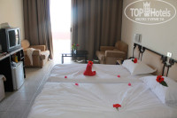 нам повезло.номера просторные ,мебель в калорите.телефизор,фен,кондей.кроватей двухспальных в отеле , мы так поняли,нет.ставят 2 полуторки.дырку можно заткнуть пледом,все так и делали.ванна с туалетом отдельная.состояние не очень,но за те деньги,которые мы заплатили ,ожидали худшего.очень красивый балкон-огромный ,со стеклянными дверьми-купе.2 кресла,столик.шкаф,тумба под тв и прикроватные-стандарт.убирают кровать ,выкладывают цветами,меняют полотенца.пол помыли 1 раз.ребята с детьми,говорят,мыли сами....