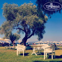 На зеленой лужайке возле пляжа растут большие оливковые деревья, под ними лежаки, чуть ближе к главному корпусу на газоне аниматоры играют с детками в разные игры нашего детства, проводят зарядку.