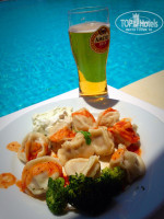 В ресторане из выпивки хорошее белое и красное вино, я видела, как открываются огромные тетрапаковские коробки и из них достают крантик, выставляют в стойку, закрывают панелью и наливается уже в бокалы, а также в самом ресторане пиво и узо. Рядом бар у бассейна - там все остальные напитки.